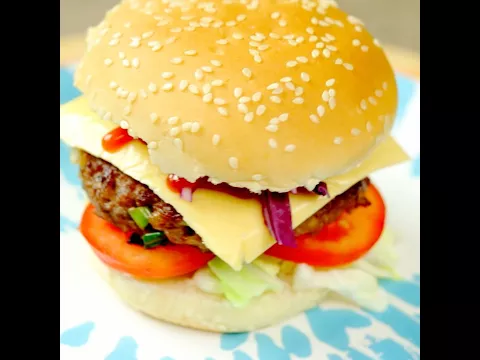 - On the bottom half of the burger bun add some mayonnaise, some shredded cabbage, the tomato slices, the burger patty, the slice of cheese, the shredded red cabbage, ketchup, and the top half of the burger bun.