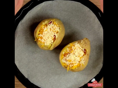 - Stuff the potatoes with shredded mozzarella, shredded Cheddar cheese, and fried bacon.