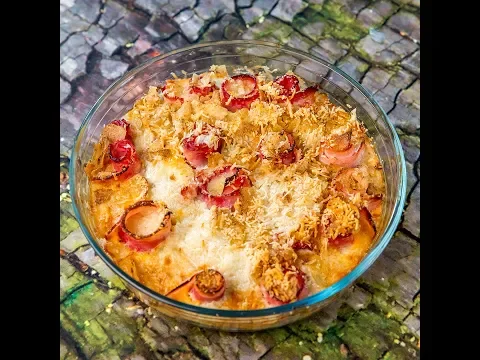 - Add the eggs and chopped onion between the bacon slices. Top with potato chips and parmesan.