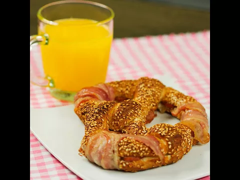 - Tightly wrap bacon slices through the holes of the pretzel.