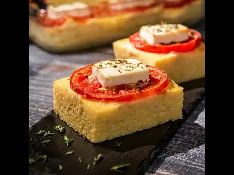 - Spread it evenly, then add the tomato slices on it. Season with herb salt, then place a feta cube over each tomato slice.