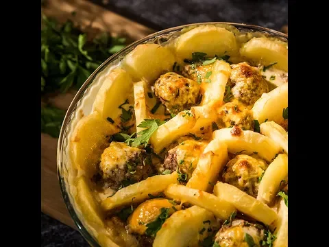 - Line a 10 x 2 inch round baking dish with most of the potato slices and add the meatballs. Fit the remaining potato slices upwards between the meatballs, creating something of an array of cells.