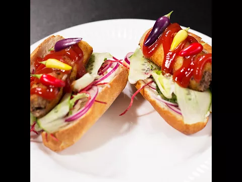 - Take one baguette and slice it through the middle. Spread 1 tablespoon of mayonnaise on the bottom bun and top with lettuce, chili and cucumber slices, 1 kebab, 1 tablespoon of ketchup, and three colored chilies.