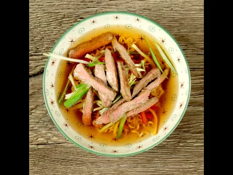 - Take a large soup bowl and begin assembling your soup. Add noodles on the bottom, cover them with bell pepper, carrot, bamboo shoots, spring onion, and thinly sliced beef.