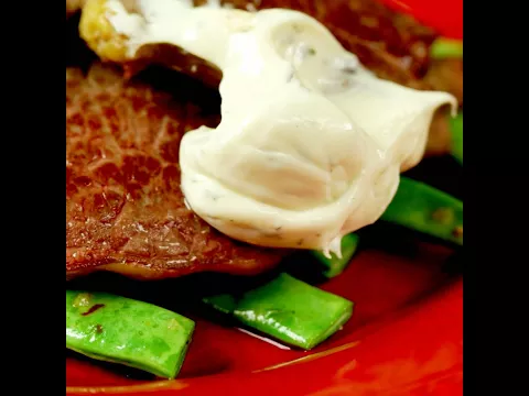 - Serve the beef steak with green beans and dressing.