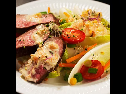 - Place the vegetable salad on 2 large plates. Add beef slices and yogurt dressing.