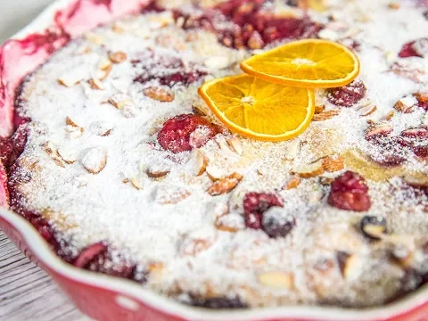 - Add the frozen berries on the bottom of a round baking tray, around 10 inches (25 cm) in diameter.