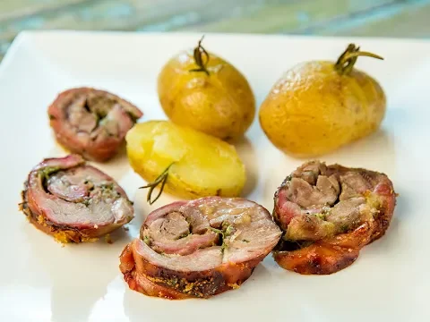 Place the lamb shoulder on the workspace, coat it with the garlic-rosemary mixture and roll it. Use cooking twine to truss the lamb roll. Slide the twine underneath the roll 0.4-0.8 inches (1-2 cm) from the end. Bring the twine’s end over, tighten the bind and make a simple knot. Make a loop with the twine, slide it underneath the roll keeping a 1-2 inches (2.5-5 cm) distance from the first loop. Pull the string a little to tighten the bind around the roll. Repeat this and make loops until you reach the lamb roll’s other end. Make a final knot to secure the whole bind. - Wrap the lamb roll in aluminum foil, put it in a baking dish and roast for 90 minutes at 400⁰F/200⁰C.