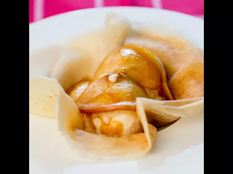- Lay one crepe on a plate, add 2 vanilla ice cream scoops, top with one caramelized apple slice, and the remaining caramel syrup.