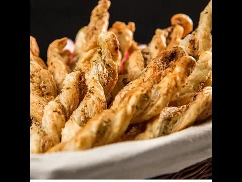 - Evenly sprinkle the grated parmesan and caraway seeds over the puff pastry sheet. Cut it into 16 long strips using a pizza/dough cutter.