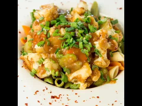 1 tablespoon vegetable oil ¼ cauliflower head, broken into florets 4 mushrooms, thinly sliced 1 celery stalk, thinly sliced salt pepper 2 garlic cloves, thinly sliced 0.25 ounce ginger, thinly sliced 1 teaspoon sesame oil 1 tablespoon soy sauce 1 tablespoon brown sugar ½ cup vegetable stock 1 teaspoon flour ½ teaspoon chili flakes parsley, choppedHow to Make Cauliflower and Celery Stew