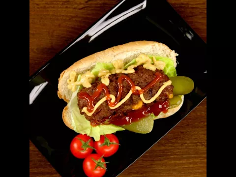 - Cut the hot dog buns and put inside of each one 2 lettuce leaves, 2-3 slices of pickled cucumber, and the burger patty.