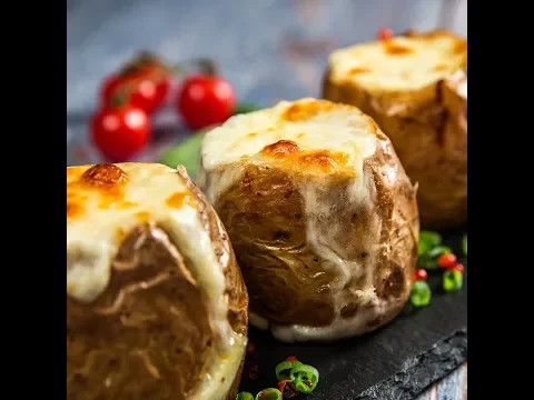 - Equally, distribute the sour cream mixture between the potatoes. Fit 3 cheddar discs and 3 salami slices, alternately stacked one over the other, inside each potato.