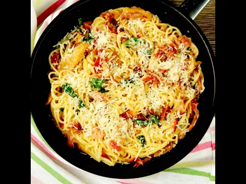 - Take another skillet, heat it and start making the pasta sauce. Add vegetable oil, tomatoes, baby spinach, and heavy cream.