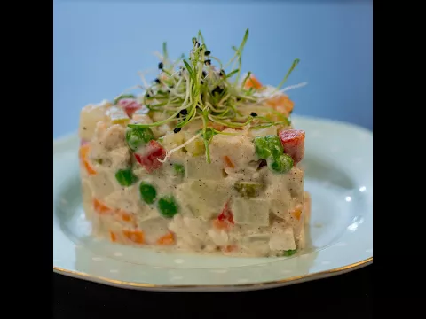 5.25 ounces of cooked chicken breast ½ red bell pepper ½ cucumber 2 tablespoons of canned peas salt 2 tablespoons of mayonnaise ⅔ cup tomato sauce 2 garlic clovesHow to Make Chicken Salad