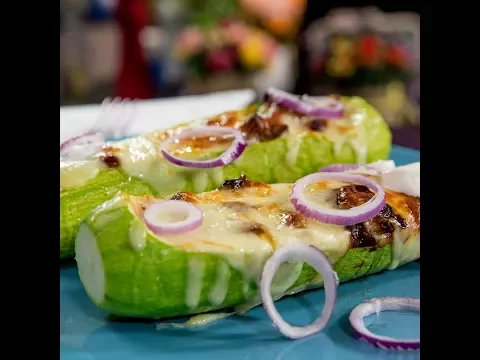 - Stuff each zucchini boat with tomato sauce and chicken mixture.