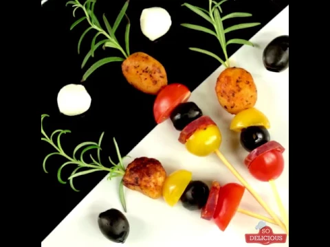 3 red cherry tomatoes 3 chorizos slices 3 black olives, pit removed 3 baby potatoes, baked 3 rosemary sprigs ½ cup shredded mozzarellaHow to Make Chorizo and Baby Potato Skewers