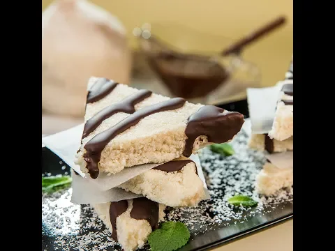 - Line a small baking pan (about 8 X 8 inches/20 X 20 cm) with parchment paper. Add the coconut filling in it, spread it around evenly and press it with a spatula. Refrigerate for 30 minutes.