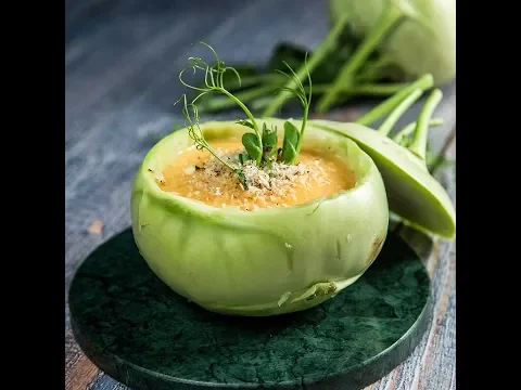 - First, cut the top off the kohlrabis. Make deep crisscrossing cuts into the pulp, then scoop it out so that you’re left with two 1/4-inch-thick shells. Save the shells as we’ll be using them for serving the soup.