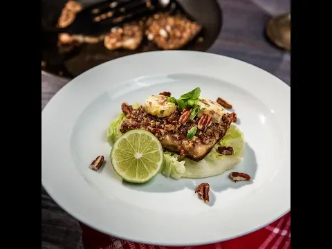 - One at a time, coat trout with egg white and crushed pecans on the flesh side of the fillets. Transfer on a plate, coated side up and refrigerate for 30 minutes.