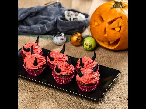 - Cut the black marzipan into small bits and shape them into horns. Make 2 horns for each cupcake.