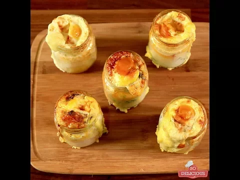 - In glass jar no. 3 add: one egg, shredded Cheddar cheese, chopped spring onion, bacon cubes, shredded Cheddar cheese, salt and pepper, and one egg.