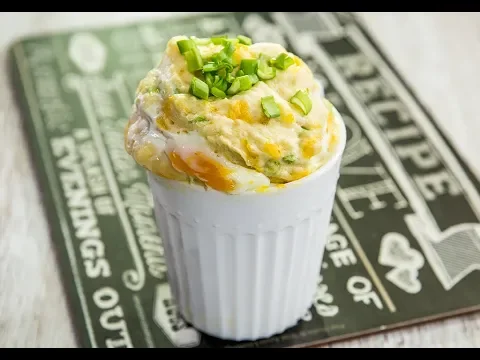 - Add about 2 tablespoons of mixture on the bottom of 2 mugs. Add one egg to each cup, then cover the eggs with some more of the mixture.