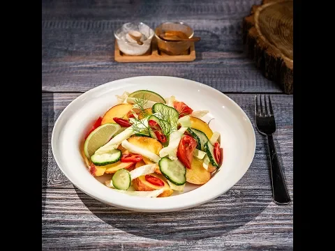 Add the endive, peach, cucumber, cherry tomatoes, fennel, and chili to a bowl. Dress with the lemon sauce and mix using two spatulas.