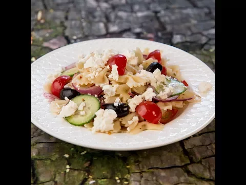- Add the red onion slices, cucumber, cherry tomatoes, and olives.