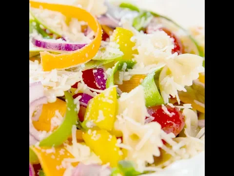 - Add the cooked pasta, cucumber, carrot, cherry tomatoes, bell pepper, and red onion to a bowl.