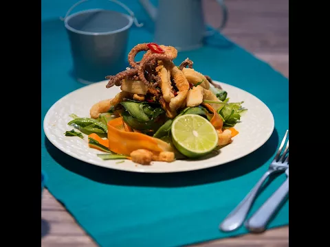- Mix the salad using your hands, and top it with the deep-fried seafood.