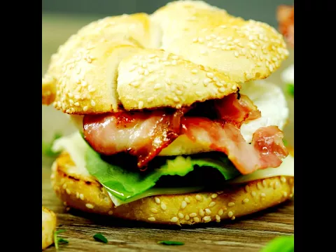 - For the first sandwich spread cream cheese and add red onion, fried egg, 1 tomato slice, 1 bok choy leaf, and crispy bacon.