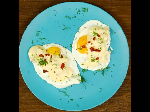 - Place the fried eggs on a plate and top them with cheese sauce.