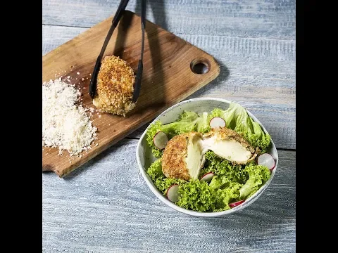 - Coat the mozzarella balls with flour, spiced egg mixture, and panko.