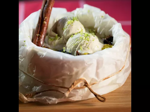 - When ready, open the parchment paper and top the fruits with the vanilla ice cream.