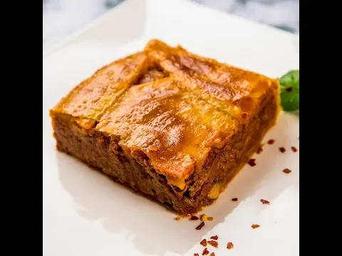 - Grease a square ceramic pan (8×8 inches) with butter. Roll out the puff pastry (keep some to cover the pie) and place it on the bottom and edges of the pan. Add the meat filling to the pan, then cover with the remaining pastry and stick its edges.