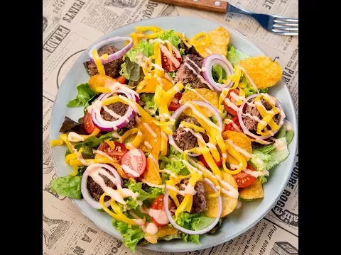 2 tablespoons of vegetable oil 7 ounces of ground beef, shaped into a square patty salt pepper 1 tablespoon mayonnaise 1 tablespoon ketchup 1 teaspoon white wine vinegar ½ lettuce head 5 cherry tomatoes 1 red onion, cut into rings ¼ cup cheddar, shredded ½ cup cheddar, shreddedHow to Make Ground Beef Salad