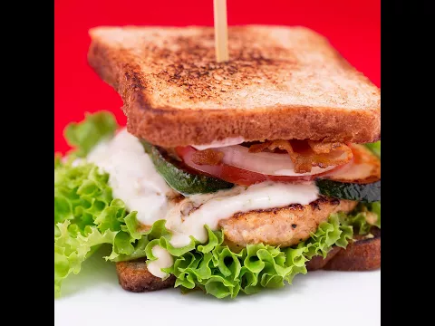 - Now, assemble your burger: take 1 slice of toast and spread the remaining mustard and ketchup. Top it with romaine salad, the burger patty, yogurt, zucchini, tomato, onion, and bacon. Finally, close it with the remaining slice of toast.