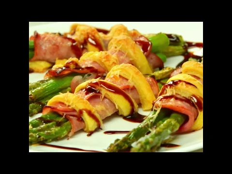 - Wrap 3 asparagus stalks with a slice of ham, then wrap a puff pastry strip around them so that it forms a spiral. Do the same with the other asparagus stalks.