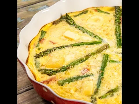 - Pour the whisked eggs, remaining asparagus, and diced mozzarella.