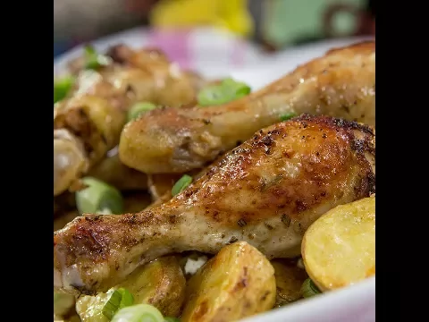 - Line a baking tray with parchment paper. Place the drumsticks and potatoes on it.