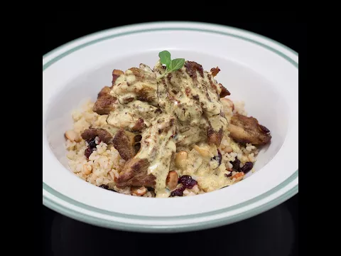 - Drizzle the fried lamb with the creamy white sauce and serve with almond and cranberry bulgur.
