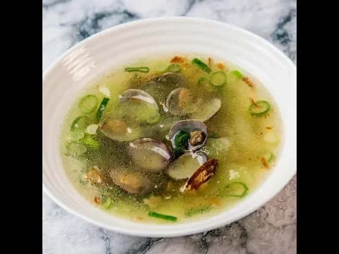 Whisk the egg, flour, and some salt into a smaller bowl. Cover the chopped onion with this batter. Heat some vegetable oil in a skillet and fry the onion until golden brown, then drain on paper towels. - Add the sesame oil, clams, melon, and chicken stock to a cooking pot over medium heat. Boil for 12 minutes. Stir from time to time, too.