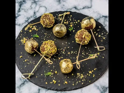 - Fill a medium bowl with water. Lay the edible gold leaves on the water surface and dip the cherry balls, one by one, so they are covered with the gold leaf.