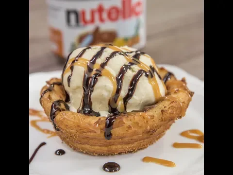 - Top the dough with Nutella, vanilla ice cream, chocolate, and caramel topping.