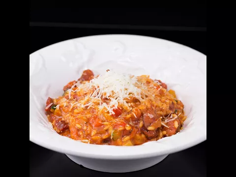 1 tablespoon vegetable oil 1 ounce butter ½ white onion, chopped 2 sausages s, sliced ½ red bell pepper, diced ½ yellow bell pepper, diced ¼ zucchini, diced ½ teaspoon dried basil ½ teaspoon paprika powder 5 ounces of arborio rice 1 cup chicken stock ¼ cup tomato sauce 1 ounce parmesan lemon zestHow to Make One-Skillet Sausage and Rice