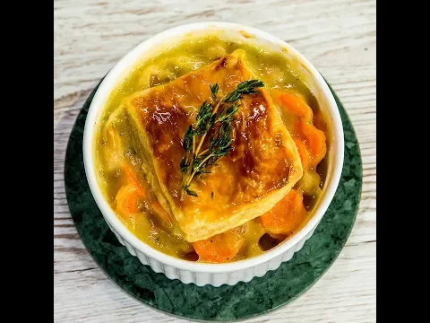 - Divide the veggie stew in 4 ramekins (4 inches/10 cm in diameter). Top each ramekin with a pastry square.