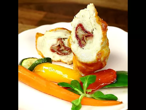 5 ounces of chicken breast salt pepper 2 pancettas ⅓ cup shredded parmesan ½ leek ¼ red bell pepper ¼ yellow bell pepper 0.25 green bell pepper ½ zucchini, sliced 2 tablespoons of olive oil ¼ cup shredded cheddar 2 black olives, without pit, thinly slicedHow to Make Pancetta and Parmesan-Filled Chicken Breast