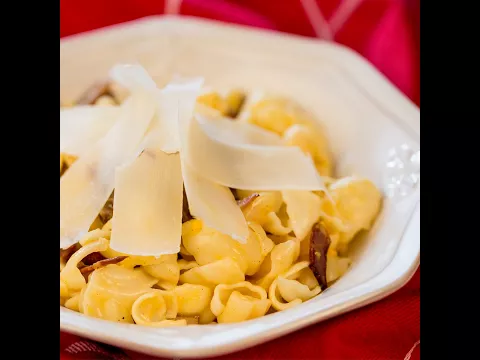 - Meanwhile, heat the vegetable oil in a skillet and add the sliced pancetta. Cook it for 1-2 minutes and add the pasta shells.