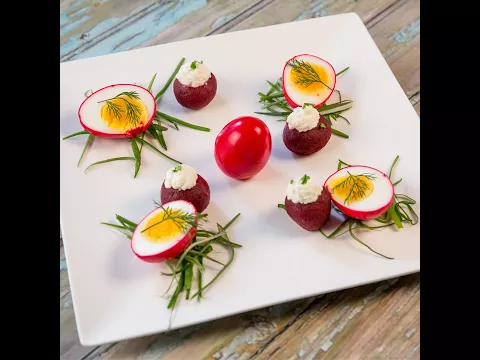 - Halve the red-colored pickled eggs and serve them with sweet beetroot.